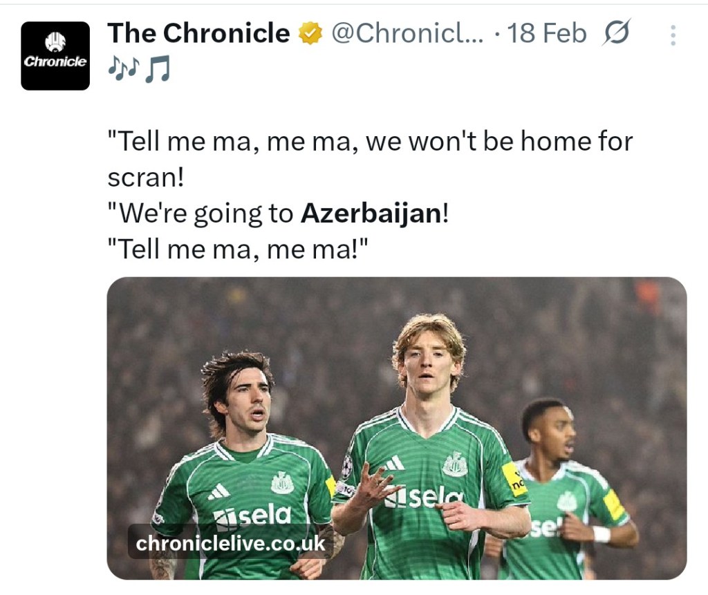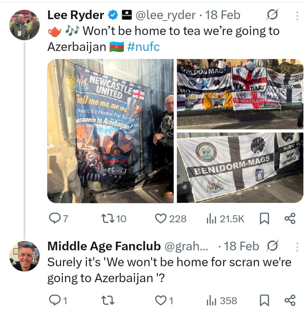 Local paper steals my headline! I could have got quite annoyed about this, but in the end it just made me smile. It came about because a local journalist put a story out on Twitter (sadly now X) about Newcastle’s Champions League tie in Baku. The story referenced a song that our fans have been singing for years, to the tune of Que Sera, Sera – ‘Tell me mam, me mam, I won’t be home for tea, we’re going to Wembley’. So, a celebration of a certain achievement where the ‘tea’ and ‘Wembley’ rhyme. But for his headline the journalist had just ended it with Azerbaijan, which doesn’t rhyme with ‘tea’…or with much at all! So, I left a comment saying wouldn’t be better as ‘scran’ (a dialect word for food) instead of ‘tea’. The journalist got back to me saying that I was right. Later however, the newspaper that said journalist writes for sent out a link to an article about our fans being in Baku, Azerbaijan’s capital, using my version of the song as their headline! Have a look for yourself!