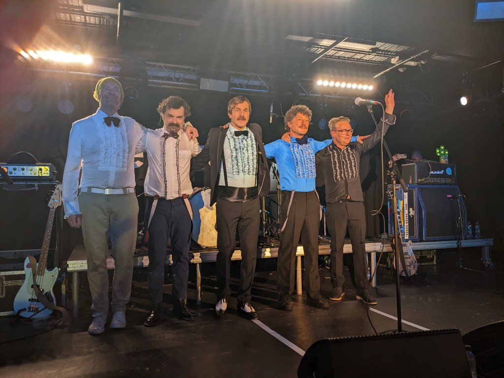The band are resplendent in what can only be labelled 70s American Prom chic, with ruffled shirts and tuxedos, bow ties and even the odd pair of braces and I for one feel like I should have made a greater effort than black t-shirt and jeans.