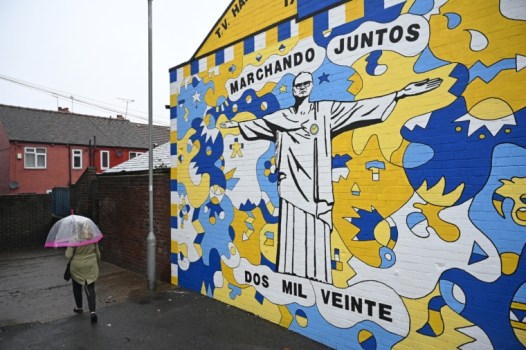A pedestrian walks past a graffiti mural depicting Leeds United’s Argentinian head coach Marcelo Bielsa as Christ the Redeemer, in Leeds, northern England on August 16, 2020. – Leeds United were promoted to the English Premier League last month after West Bromwich Albion’s 2-1 defeat at Huddersfield ensured the Championship leaders ended their 16-year exile from the top-flight. (Photo by Oli SCARFF / AFP) (Photo by OLI SCARFF/AFP via Getty Images)