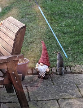 Previous Image Next Image PXL_20230120_150119981 Sammy, as bold as brass on our patio, chatting to a garden gnome about breaking my bird feeder, no doubt